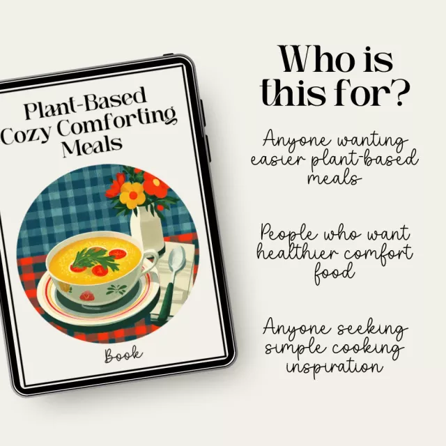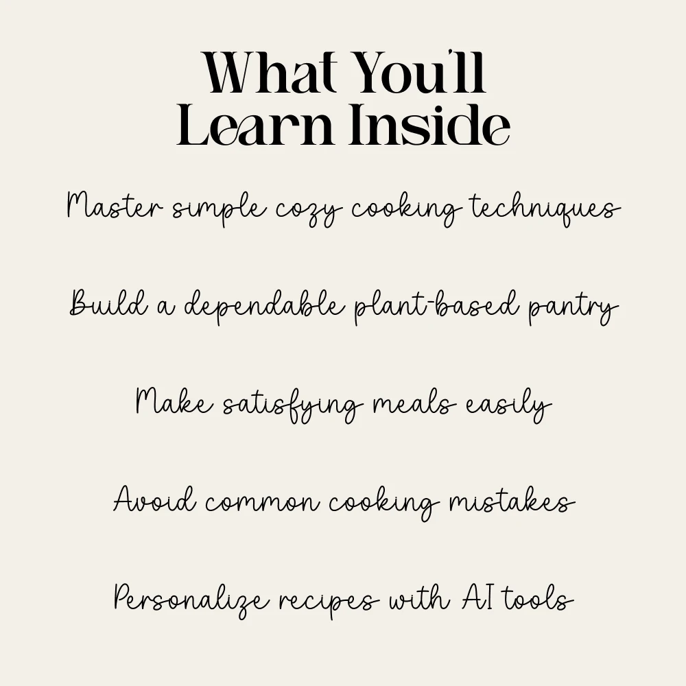 Download your copy today and start creating plant-based meals that warm the soul, simplify your routine, and fill your home with comfort. Your coziest plant-based kitchen begins here.
