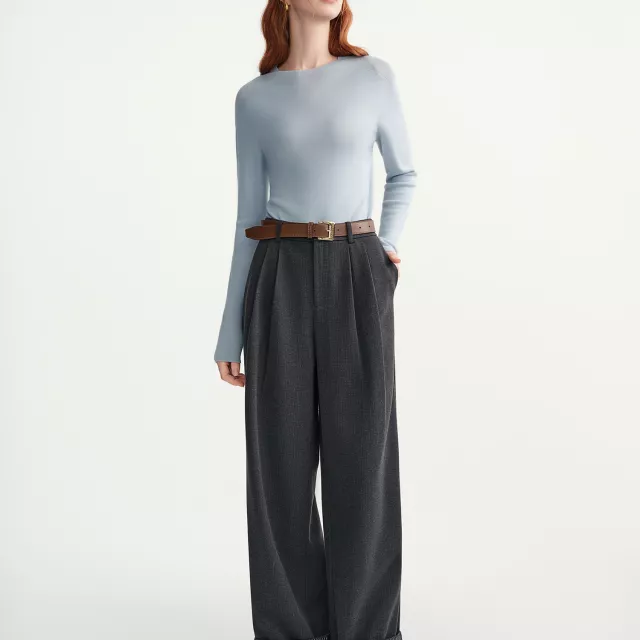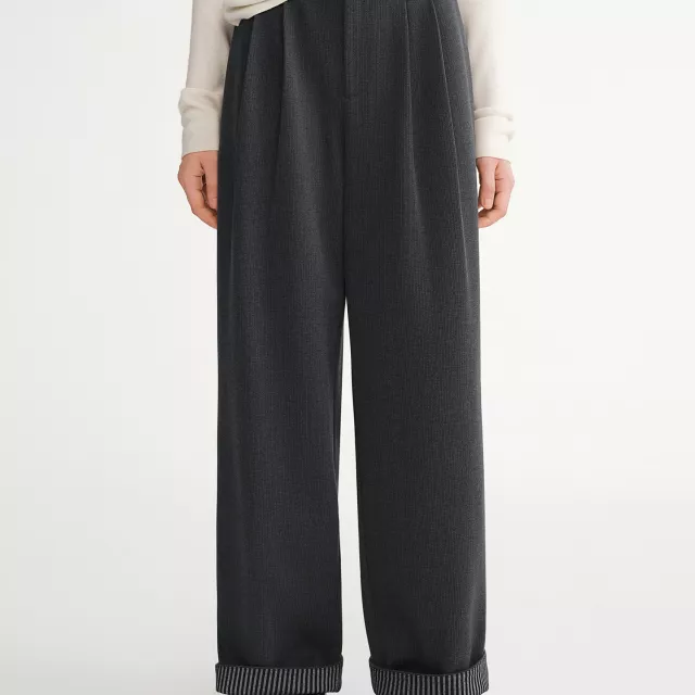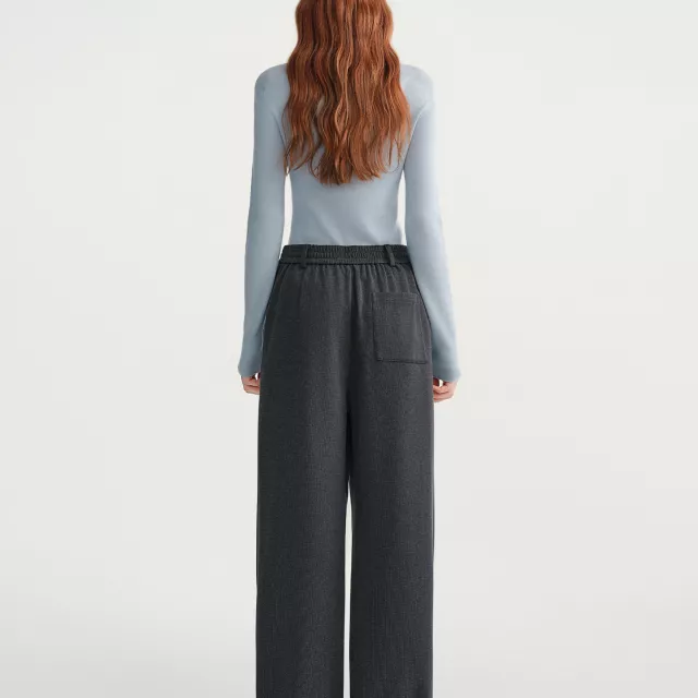 The thoughtful pleated design adds a touch of sophistication while enhancing comfort and movement. The half-elastic waist offers flexibility without sacrificing elegance, ensuring a smooth silhouette. These pants combine simplicity with refinement, making them a reliable go-to piece in any everyday wardrobe. Their solid gray color pairs effortlessly with sweaters, blouses, long coats, and winter layers.