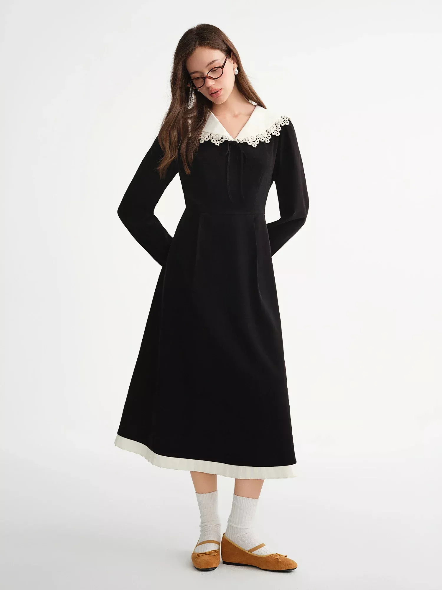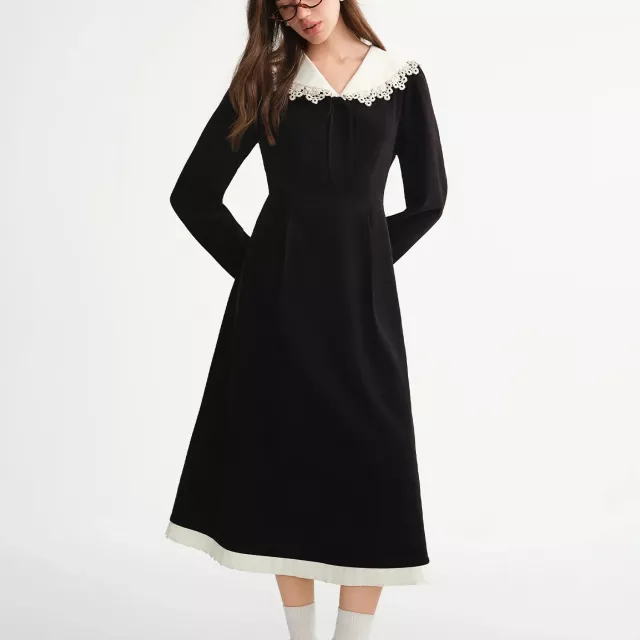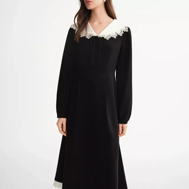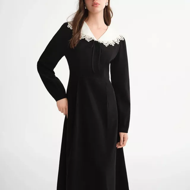 This dress is more than just a wardrobe piece; it’s a statement of confidence and grace. Its combination of classic turnover collar, lace applique detailing, and color-blocked design makes it unique and stylish for middle-aged women looking for both elegance and practicality. Pair it with heels or boots for an office-ready look, or dress it up with accessories for a memorable evening event. The mid-calf length and long sleeves keep you warm without compromising style, making it a winter essential for your collection.