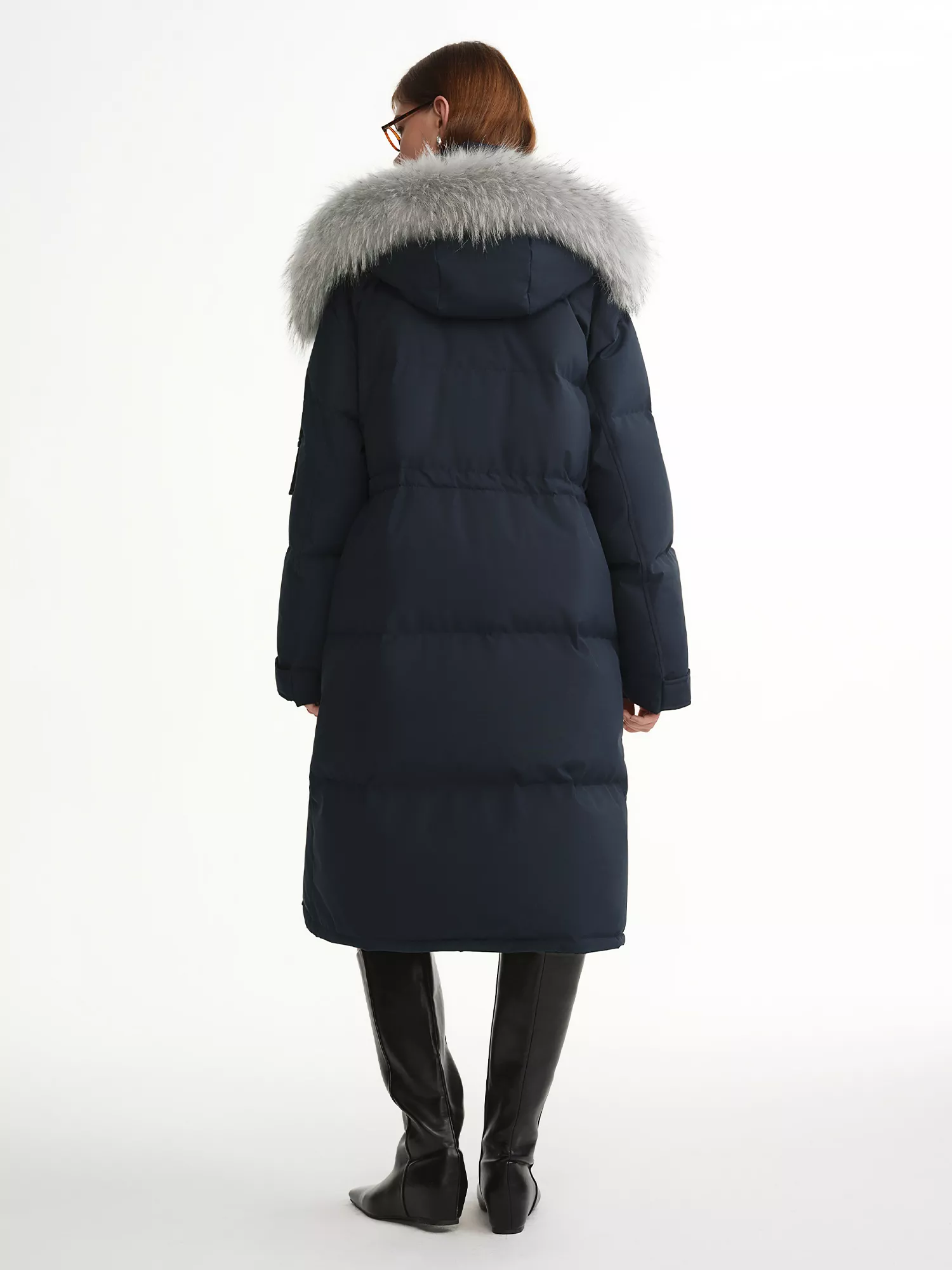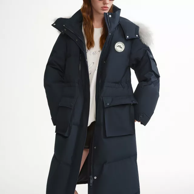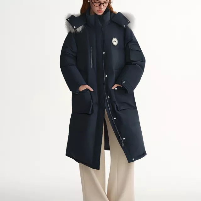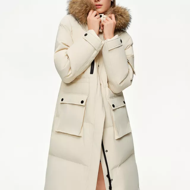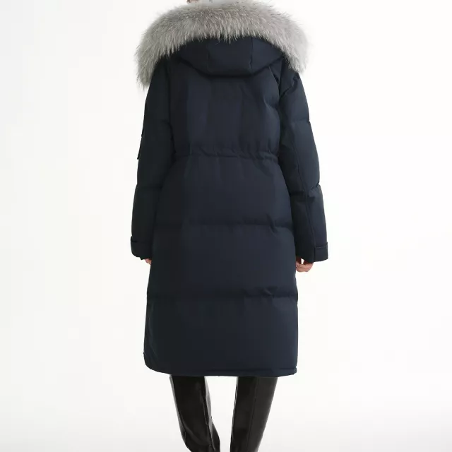 This winter parka is built with practical details that make cold weather easier to handle. The coat features a wide-waisted silhouette for relaxed movement, a full-length front zipper for quick wear, and a hood trimmed with genuine raccoon dog fur for an elevated finish. Filled with high-quality white duck down, it delivers impressive insulation with 90 percent down content and a total fill weight of 165–190 g. At just about 1.52 lb, it stays lightweight while providing steady warmth.