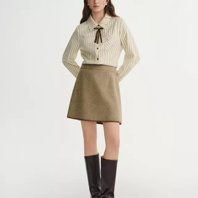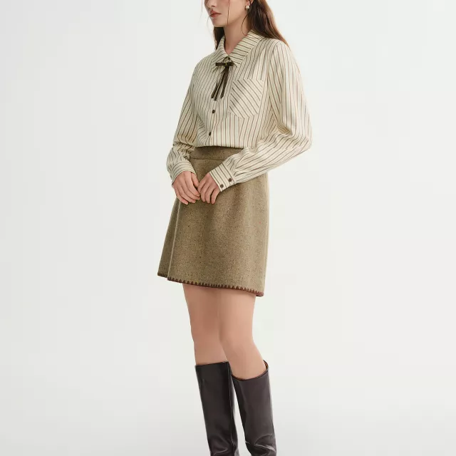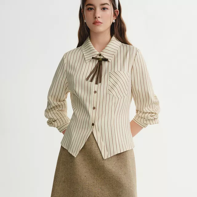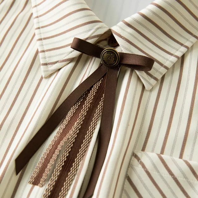 Step into winter with confidence and style with this gorgeous caramel striped shirt. The slim fit design enhances your silhouette while offering enough flexibility to ensure comfort throughout the day. Its high-quality polyester and spandex blend provides the perfect balance of softness, stretch, and durability. You can wear this shirt from the office to the weekend without missing a beat. The bow detail and striped pattern add an extra touch of charm, making it a standout piece in your wardrobe.