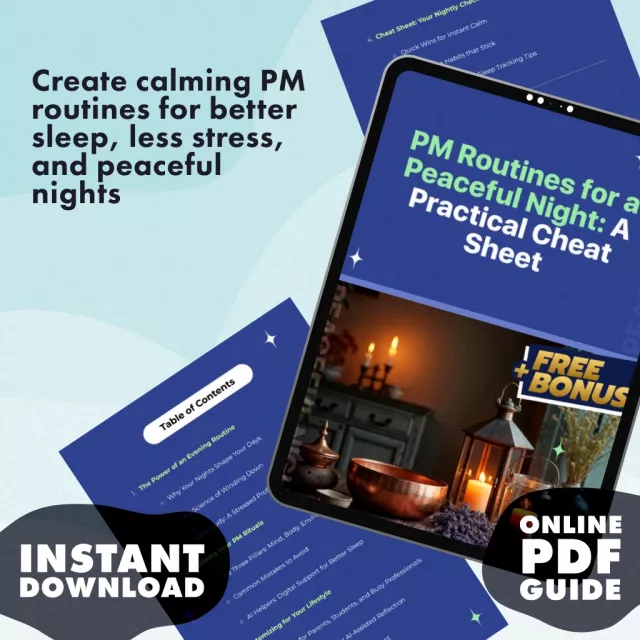 This guide stands out from other digital resources by offering a unique blend of scientific insights, practical strategies, and real-life case studies. With “PM Routines for a Peaceful Night Cheat Sheet,” you’ll not only understand the importance of a solid evening routine, but you’ll also have a roadmap to create one that works for you. Unlike other generic sleep tips, this guide gives you a customizable approach for your specific lifestyle, whether you’re balancing family responsibilities, working long hours, or studying late into the night. Plus, the integration of AI tools offers a modern twist that supports your sleep journey.