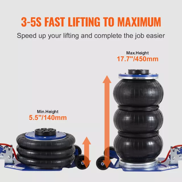 This air jack is a versatile companion for both professional mechanics and DIY car enthusiasts. It’s perfect for tire changes, brake inspections, suspension work, or undercarriage access. With a generous lifting range of 5.5 to 17.7 inches, it accommodates different vehicle heights with ease, ensuring you can tackle a variety of maintenance and repair jobs without hassle.