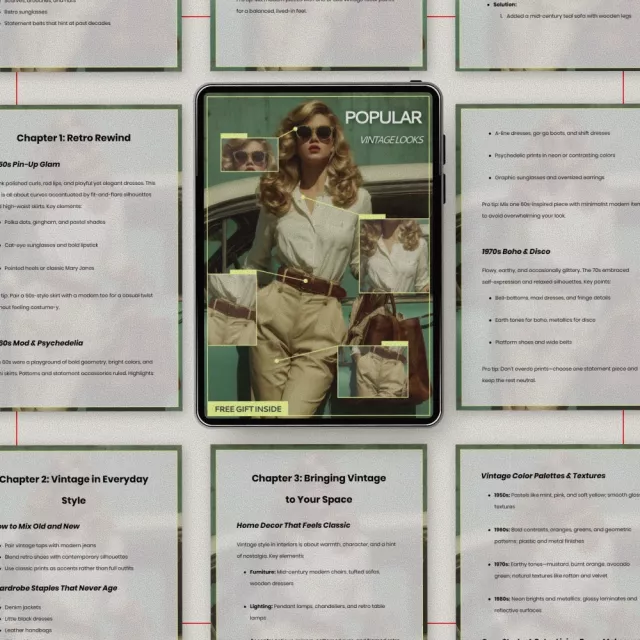 Ever wondered what vintage looks are popular and how to actually use them in real life? Popular Vintage Looks is a beautifully organized digital guide that walks you through the most iconic retro eras and shows you how to bring them into your wardrobe, home, and creative projects today. Whether you love classic fashion, nostalgic interiors, or experimenting with AI-generated visuals, this guide makes vintage style feel approachable, modern, and inspiring.