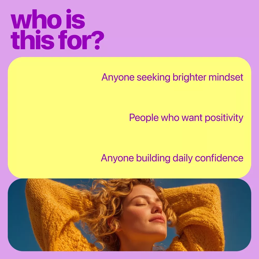 This isn't just for beginners exploring positivity either- professionals dealing with stress or students looking to build confidence will find immense value here too! It's truly transformed the way I think, feel and show up every day :)