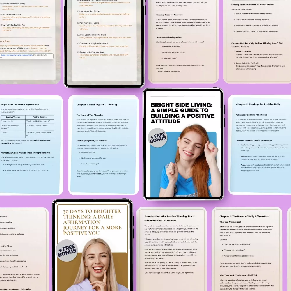I've been using this digital bundle for a while now and it's really made a difference in my life. The simple guide to building a positive attitude was so clear and easy to understand, I started implementing the steps immediately. It's not just about thinking happy thoughts, but actually creating healthier thought patterns that last.