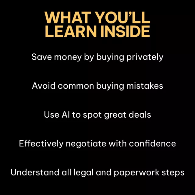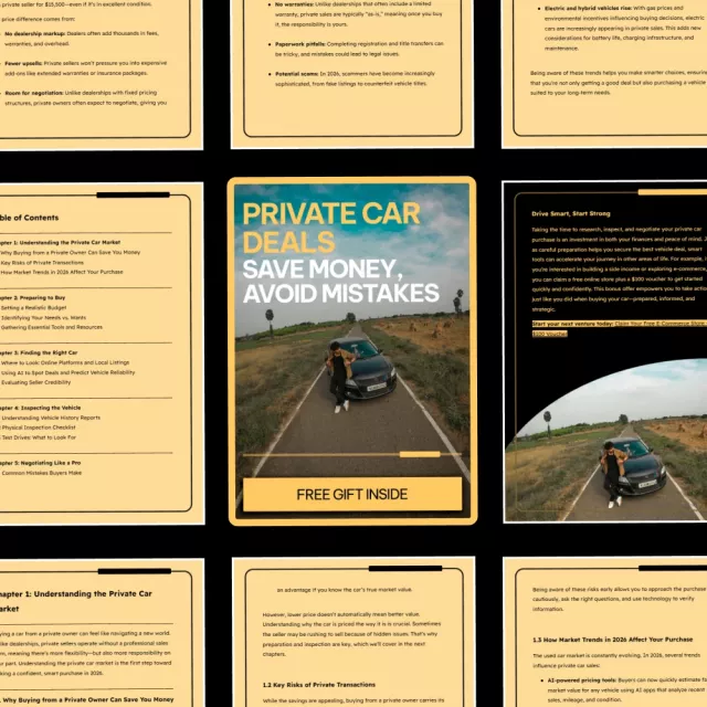 This ebook is perfect for anyone looking to buy a used car from a private owner. Whether you’re searching for your first vehicle or upgrading to something new, “Private Car Deals: Save Money, Avoid Mistakes” offers the most up-to-date information and strategies to help you make a smart purchase. Unlike other resources, this guide incorporates AI tools and data trends to give you a cutting-edge advantage in today’s market.