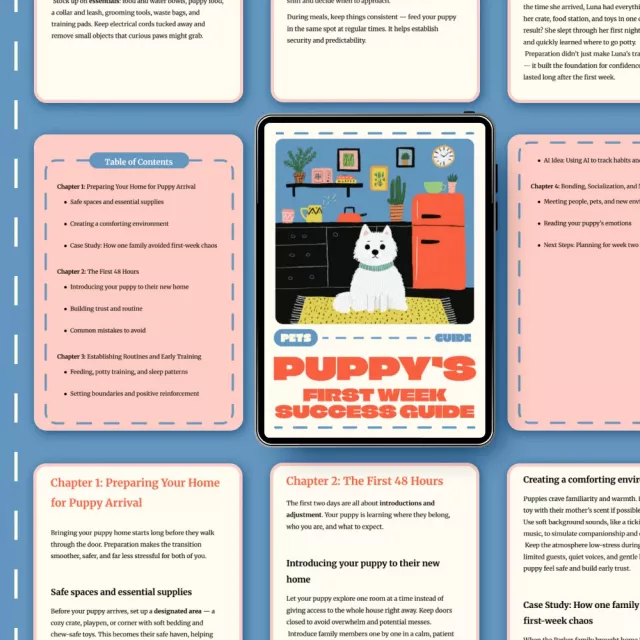 Welcome your new furry family member with confidence and calm! The Puppy’s First Week Success Guide is your ultimate companion for navigating the most important first days with your new puppy. This digital download is designed for new and soon-to-be dog owners who want to create a safe, structured, and loving environment from day one. With practical steps, expert insights, and even an AI-powered training idea, this eBook helps you prevent chaos and build lifelong habits for your pup’s happiness and success.