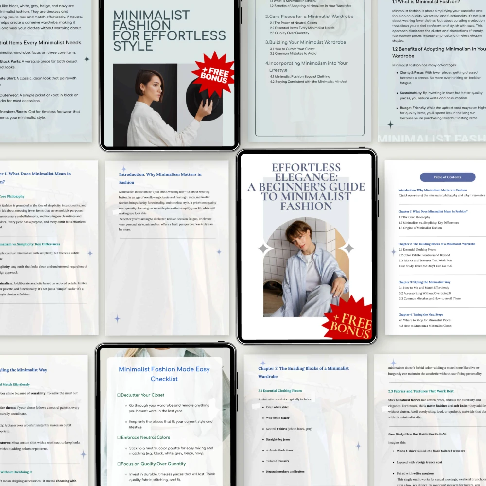 Are you ready to embrace timeless, effortless style? Our Pure Minimalist Fashion Foundations Pack is here to help you refine your wardrobe and develop a polished, minimalist look that exudes sophistication and simplicity. This 5-in-1 bundle is designed to guide you through the essentials of minimalist fashion, empowering you to create stylish, sustainable outfits with ease. Whether you’re a beginner or looking to enhance your minimalist style, these carefully curated digital downloads will help you achieve an elegant, clutter-free wardrobe.