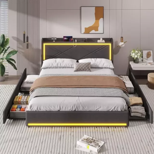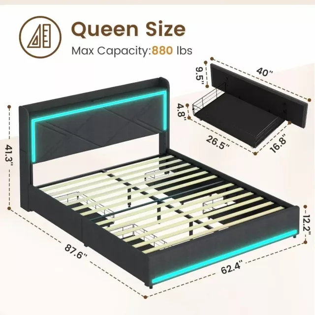 Queen Bed Frame with RGB LED Lights, USB Charging, and Storage Drawers