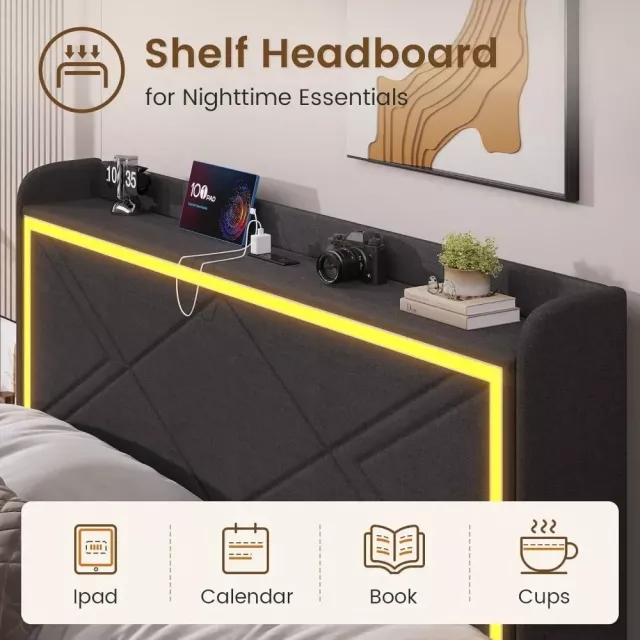 • RGB LED Lights on Headboard and Footboard: Create the perfect ambiance with customizable lighting options. Choose from 12 vibrant colors, 100+ dynamic modes, and 6 brightness levels—all easily controlled via the included remote or phone app.