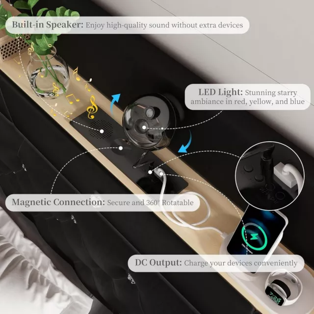 Unlike ordinary bed frames, this one fuses innovative tech and stylish design to bring something truly unique to your home. The magnetic, detachable projector lets you adjust your ambiance at any time. Spacious drawers and hidden headboard compartments reduce clutter, while the bold high headboard makes a stunning visual statement. Whether it’s for movie nights, winding down with white noise, or just creating a cozy vibe, this bed does it all—effortlessly.