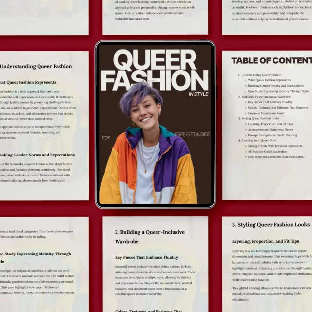 Unlock the power of self-expression and break free from traditional fashion boundaries with “Queer Fashion in Style.” This guide is your go-to resource for creating a wardrobe that celebrates fluidity, inclusivity, and individuality. Whether you’re looking to build a queer-inclusive wardrobe, explore how to mix trends with personal expression, or get inspired by the latest queer fashion looks, this digital download has everything you need to elevate your style. It’s time to embrace your true self, boldly and confidently.