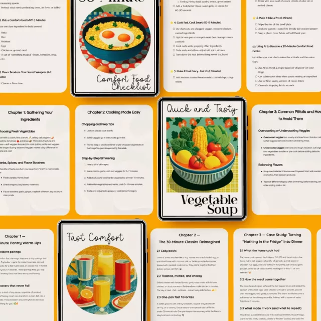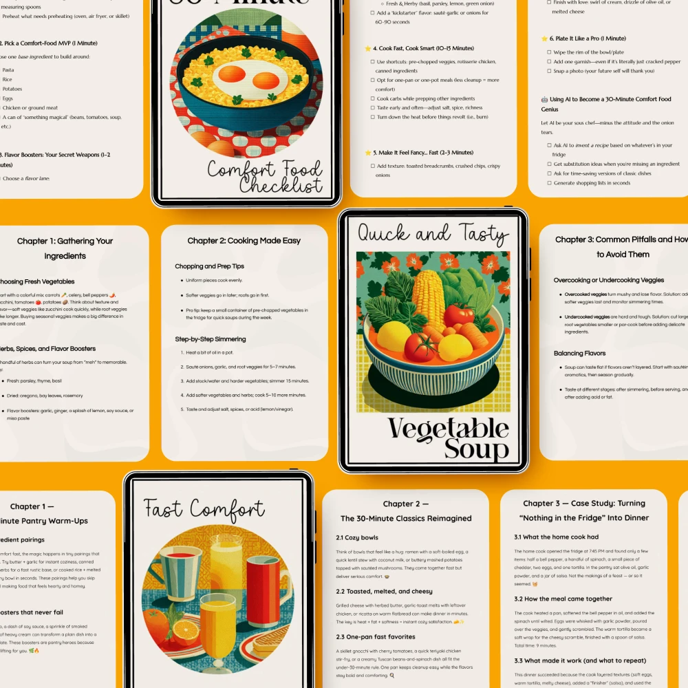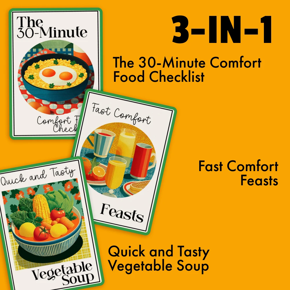 What a find! I've been struggling with meal planning, but this bundle has made my life so much easier. The 30-Minute Comfort Food Checklist is my go-to for quick and satisfying dinners after a long day at work. Plus, the Fast Comfort Feasts guide offers easy recipes that are not only delicious but also ready in no time.