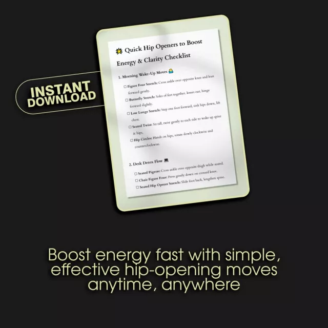 Discover how a few minutes of mindful movement can transform your day with the Quick Hip Openers to Boost Energy Checklist. This beautifully designed digital download helps you unlock your energy, improve clarity, and release hip tension—no yoga experience required! Whether you’re starting your morning, taking a desk break, or winding down in the evening, this simple guide makes it easy to integrate movement into your daily routine. Perfect for busy professionals, fitness enthusiasts, or anyone seeking more vitality and flow in their body and mind.