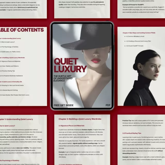 • Chapter 1: Understanding Quiet Luxury, including the psychology behind subtle style and how it differs from flashy luxury