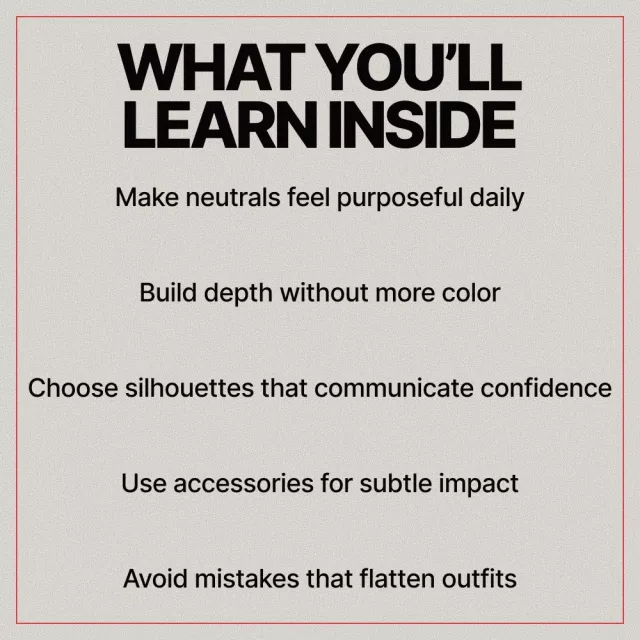 This digital download walks you step by step through the foundations of strong neutral dressing, using real-world examples and easy-to-apply concepts.