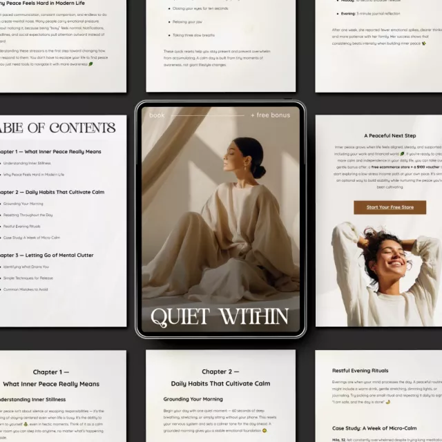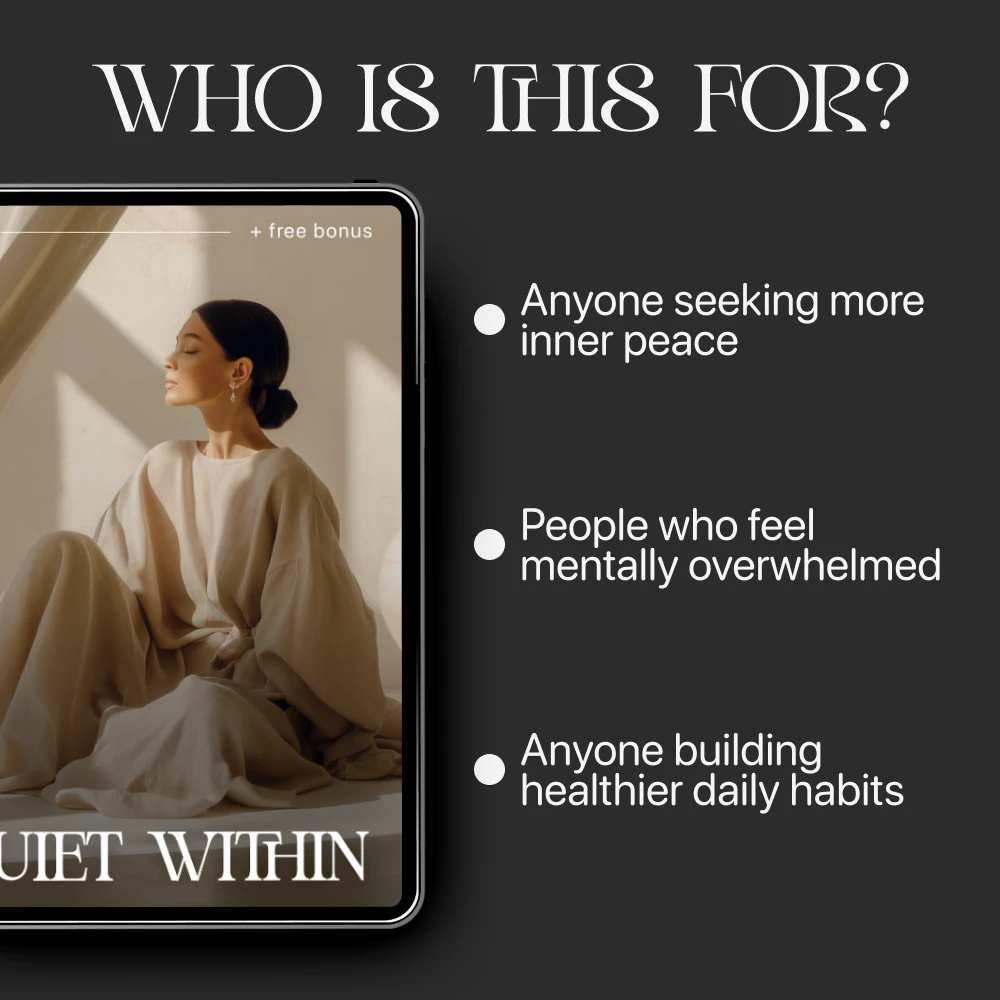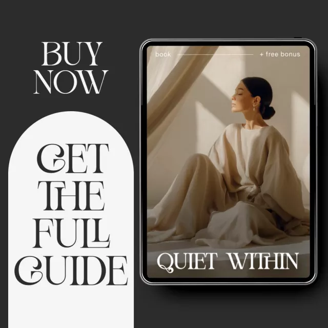 If your mind feels busy, heavy, or constantly “on,” this ebook is your invitation to slow down. Quiet Within is a gentle yet practical guide designed to help you create calm in a noisy world. Instead of unrealistic promises, it offers small, doable steps that fit into real life. You’ll learn how to find inner peace without escaping your responsibilities, isolating yourself, or overcomplicating the process. This digital guide works for modern life — busy schedules, emotional overwhelm, and constant digital distractions included.