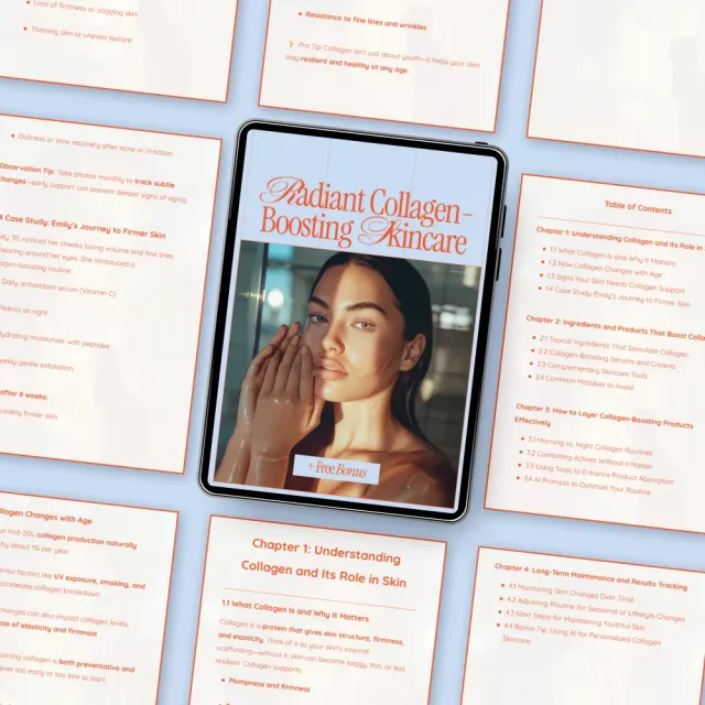 Radiant Collagen-Boosting Skincare is a comprehensive digital download designed to help you understand, protect, and naturally support your skin’s collagen at every stage of life. This easy-to-follow guide blends skincare science with real-world routines, ingredient education, and modern AI support so you can finally build a collagen-focused routine that actually works. Whether you’re noticing early signs of aging or looking to maintain firm, radiant skin long term, this resource gives you clarity, confidence, and a proven framework to follow.