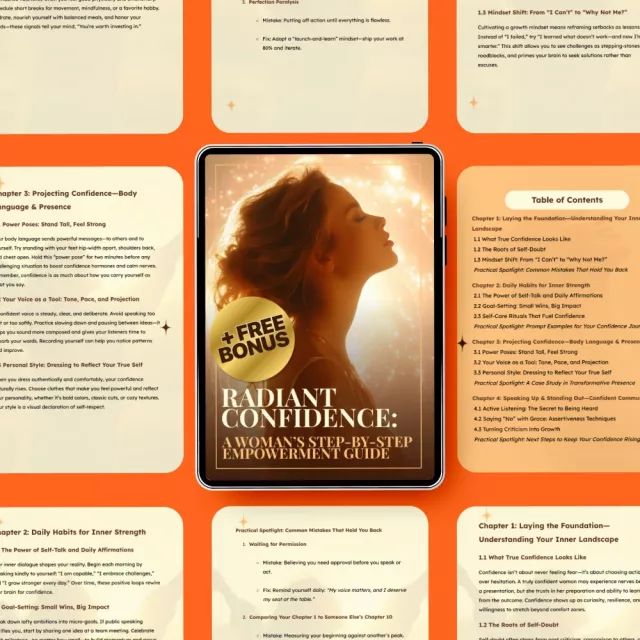 “Radiant Confidence” is more than just an ordinary self-help book. It’s a tailored blueprint that takes you on a step-by-step journey from self-doubt to self-empowerment. Unlike other guides, this eBook is packed with actionable advice and real-life exercises that ensure you see immediate results. You won’t just read about confidence; you’ll experience it as you work through the practical strategies and mindset shifts designed specifically for women who are ready to transform their lives.