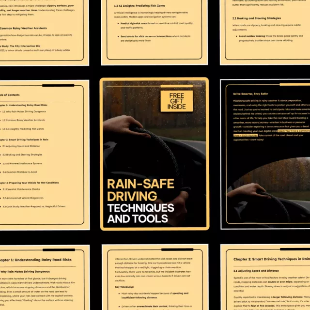 Rain can turn an ordinary drive into a high-risk situation in seconds. Rain-Safe Driving: Techniques and Tools is a comprehensive digital guide designed to help you stay calm, prepared, and in control when driving in wet conditions. Blending real-world experience with modern AI insights, this guide breaks down complex safety concepts into clear, easy-to-follow steps. Whether you’re commuting daily or planning longer trips, you’ll gain reliable, actionable knowledge that makes rainy weather driving safer and less stressful.