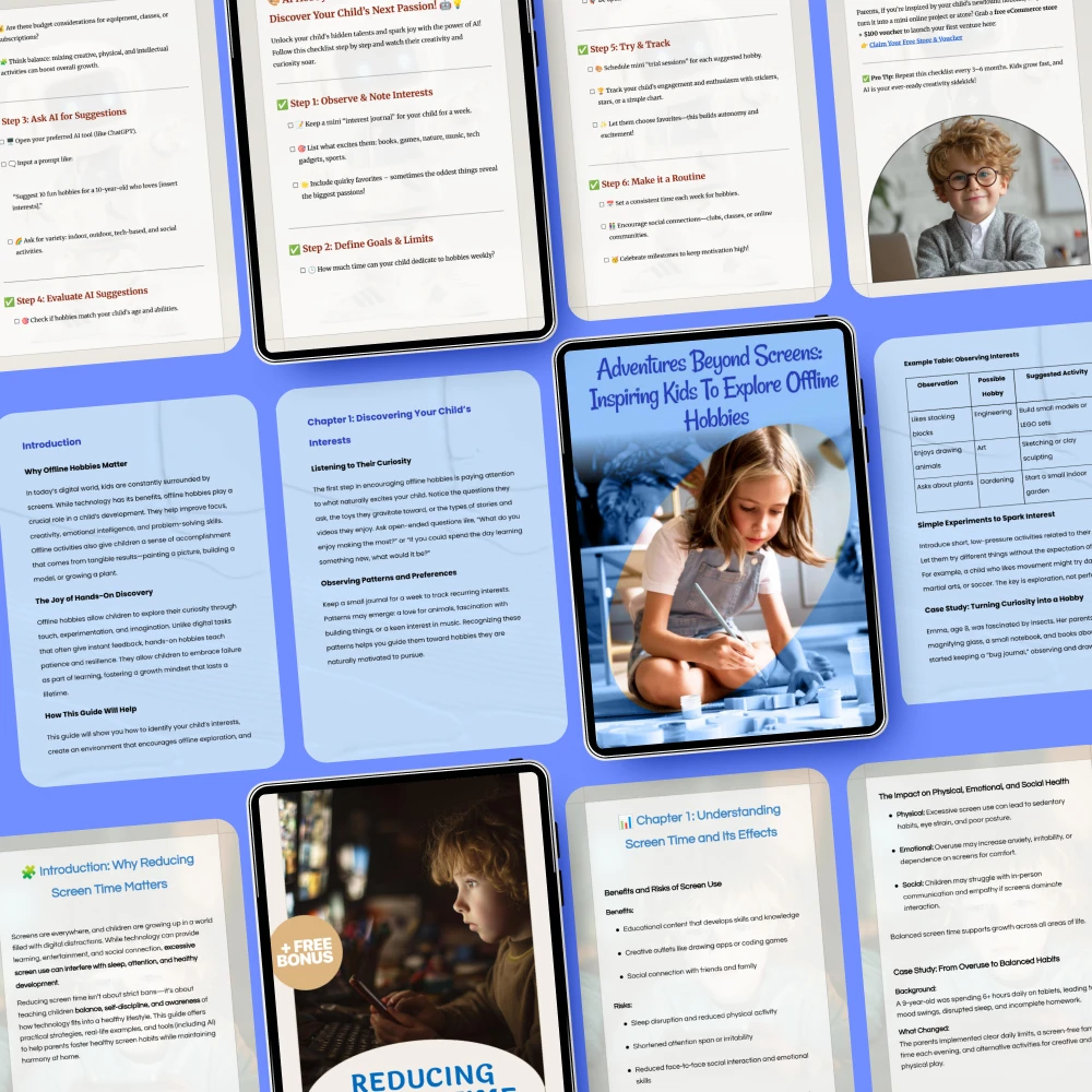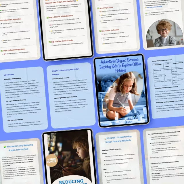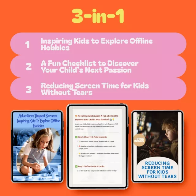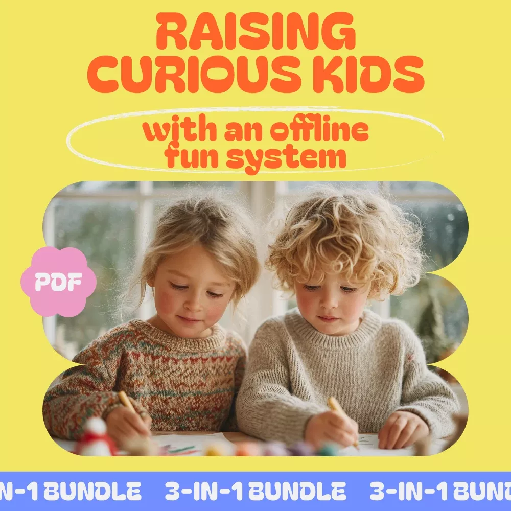 In a world dominated by digital screens, finding ways to engage your child in offline activities is more important than ever. Our “Raising Curious Kids with an Offline Fun System” 3-in-1 digital bundle is here to help you do just that! This comprehensive package offers practical guides, eBooks, and checklists that provide the perfect resources to inspire your kids to explore new offline hobbies and reduce their screen time in a fun, engaging way.