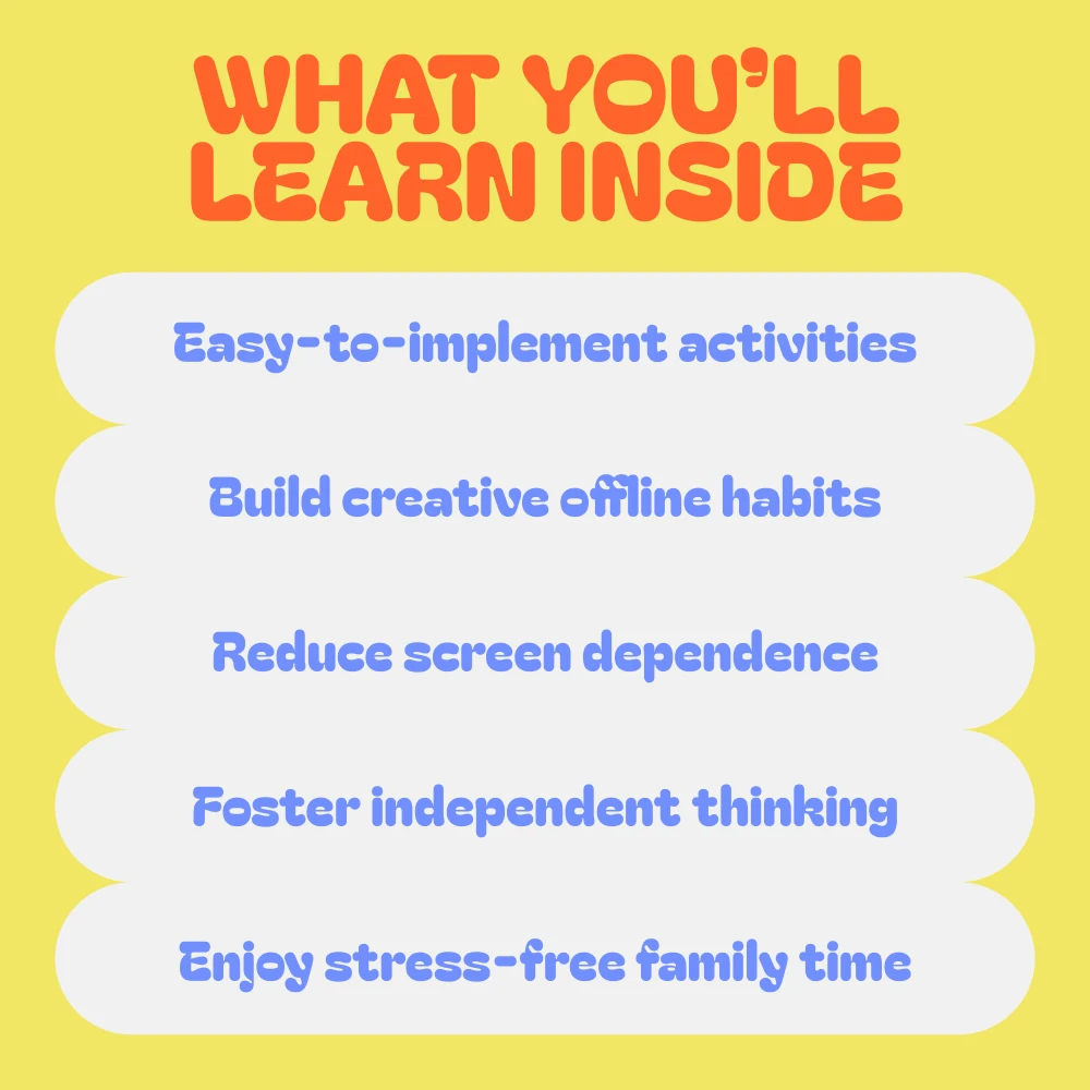 Unlike other digital resources, this bundle is specifically designed to address the growing concern of screen time and its impact on children’s development. We’ve carefully curated each guide and checklist with the goal of making the transition to offline activities fun and easy. Our actionable steps and expert-backed advice help you encourage offline hobbies in a way that’s stress-free, engaging, and effective.
