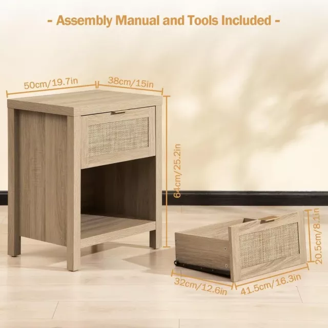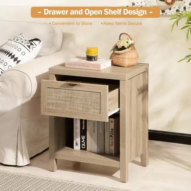 Rattan Nightstands Set of 2 – Farmhouse Boho Bedside Tables with Drawer & Shelf