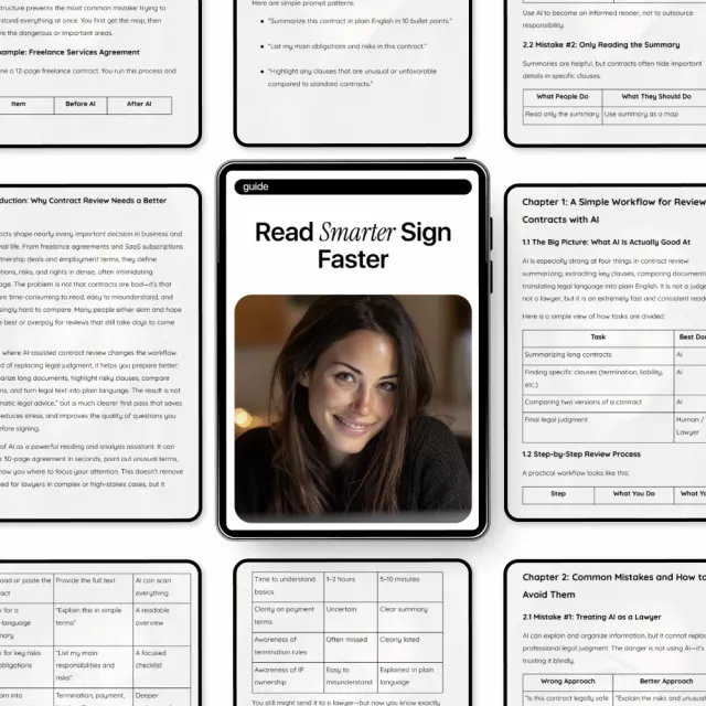 Contracts shouldn’t feel overwhelming, intimidating, or impossible to understand. Read Smarter Sign Faster is a practical, easy-to-follow guide designed to show you how to approach contract review with ai in a smart, safe, and effective way. Instead of guessing what matters or relying on vague summaries, this guide helps you build a clear workflow so you can understand agreements faster, spot risks sooner, and make better decisions before you sign.