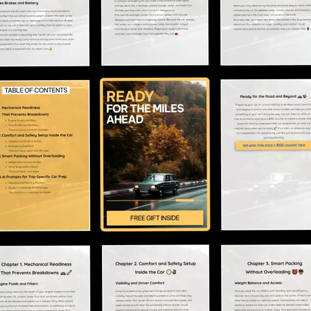 This digital guide is perfect for road trip enthusiasts, families, solo travelers, and anyone who wants to take their car journeys to the next level. Unlike generic checklists, Ready for the Miles Ahead combines mechanical know-how, comfort tips, packing strategies, and AI prompts to create a fully personalized road trip preparation experience.