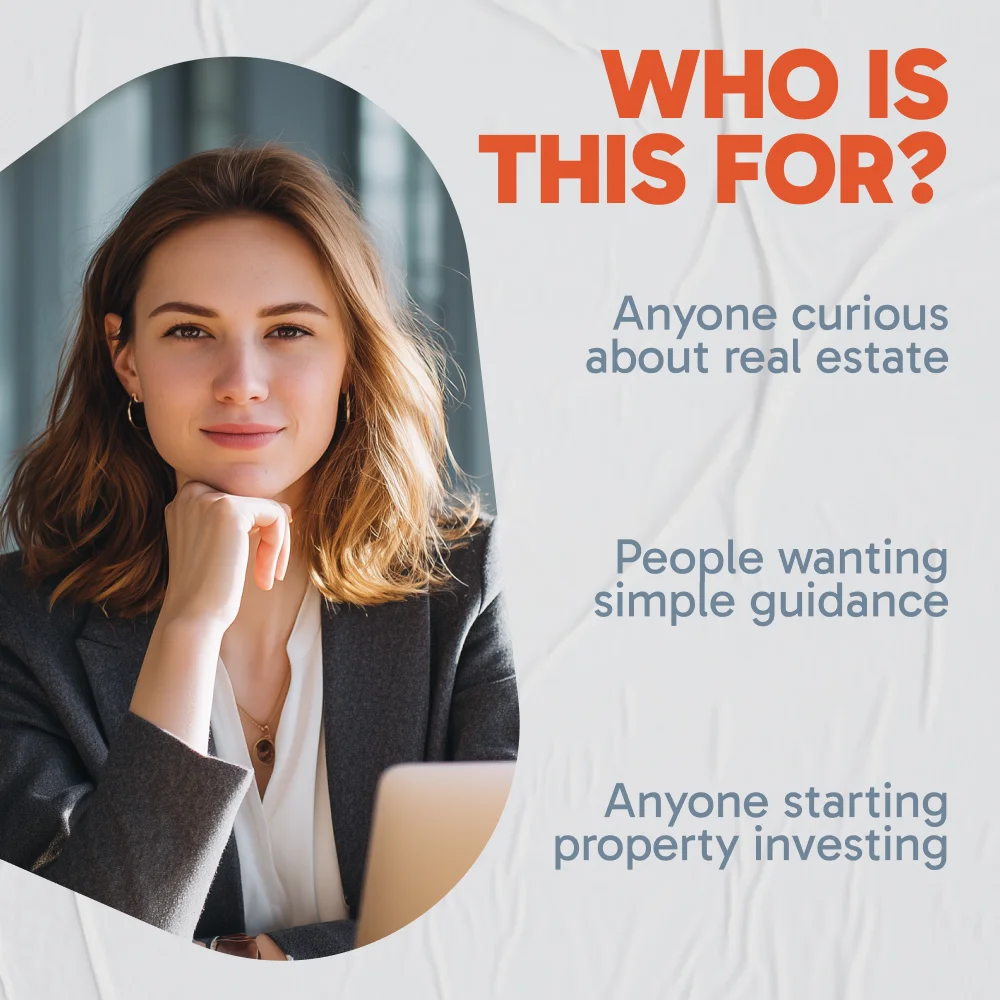This toolkit is perfect for absolute beginners who want to learn how to get a start in real estate, aspiring investors seeking actionable steps, or anyone looking for a structured roadmap to enter the property market confidently. It’s designed to save you time, reduce mistakes, and give you a clear path forward.