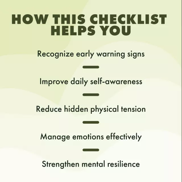 Unlike long guides or overwhelming resources, this concise checklist is designed for quick recognition and daily support. It makes it easy to track stress and anxiety symptoms without feeling burdened. Clear, straightforward, and actionable—this tool helps you bridge the gap between awareness and action.
