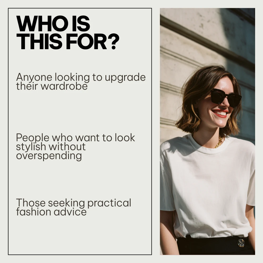 The guide helped me figure out how to make my existing wardrobe feel fresh and stylish. It's perfect for anyone on a budget who still wants to look amazing. I’m so happy with how my outfits are looking now!