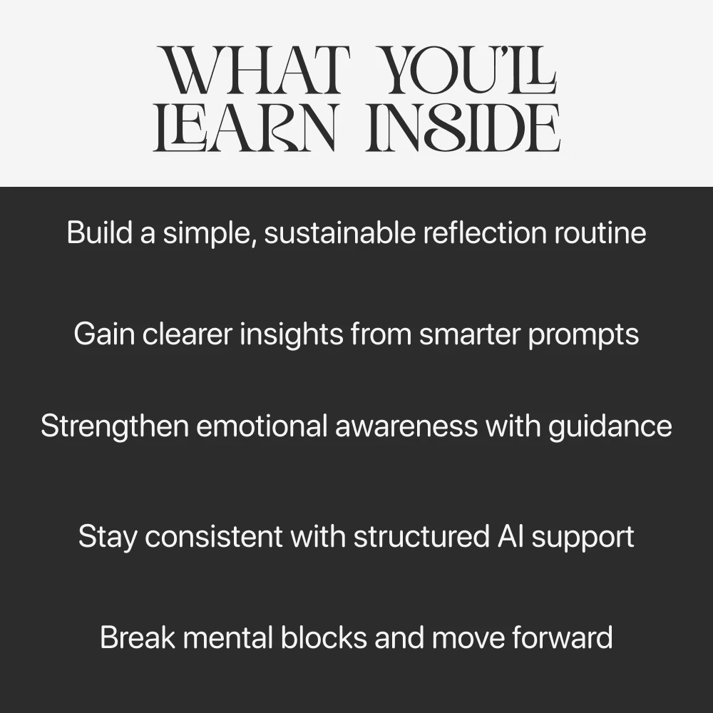 • Chapter 1 — Why AI Helps You Reflect Better: How AI Supports Honest Self-Inquiry, When to Use AI for Reflection, plus a real weekly AI check-in case study.