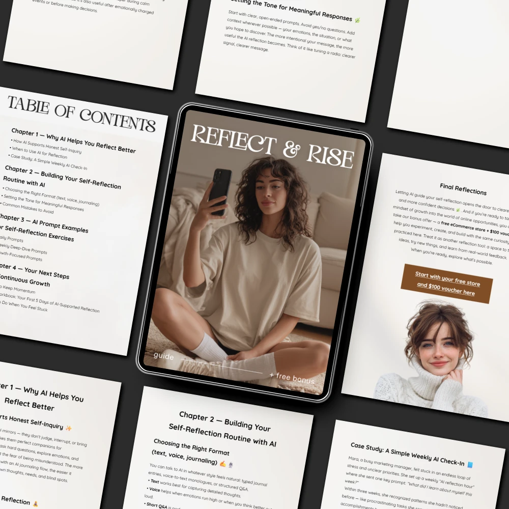 Reflect & Rise is a transformative digital download designed to help you build a powerful, consistent self-reflection routine using the support of AI. Blending the clarity of a guide, the depth of an eBook, and the simplicity of a checklist, this resource gives you everything you need to understand yourself better, set meaningful goals, and create a growth-focused mindset. Whether you’re new to self-reflection or want to deepen your practice, this beautifully structured tool makes the journey simple, encouraging, and inspiring.