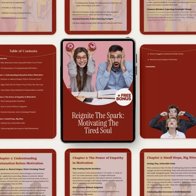 When someone you care about feels completely drained, traditional motivation advice often falls flat. Reignite the Spark: Motivating the Tired Soul is a thoughtfully designed ebook that meets exhaustion with empathy, clarity, and practical tools. Instead of pushing harder, this guide shows you a kinder, more effective way forward—one that truly understands what fatigue does to the mind and body. If you’ve ever wondered how to motivate someone who is tired without adding pressure or guilt, this resource was created for you.