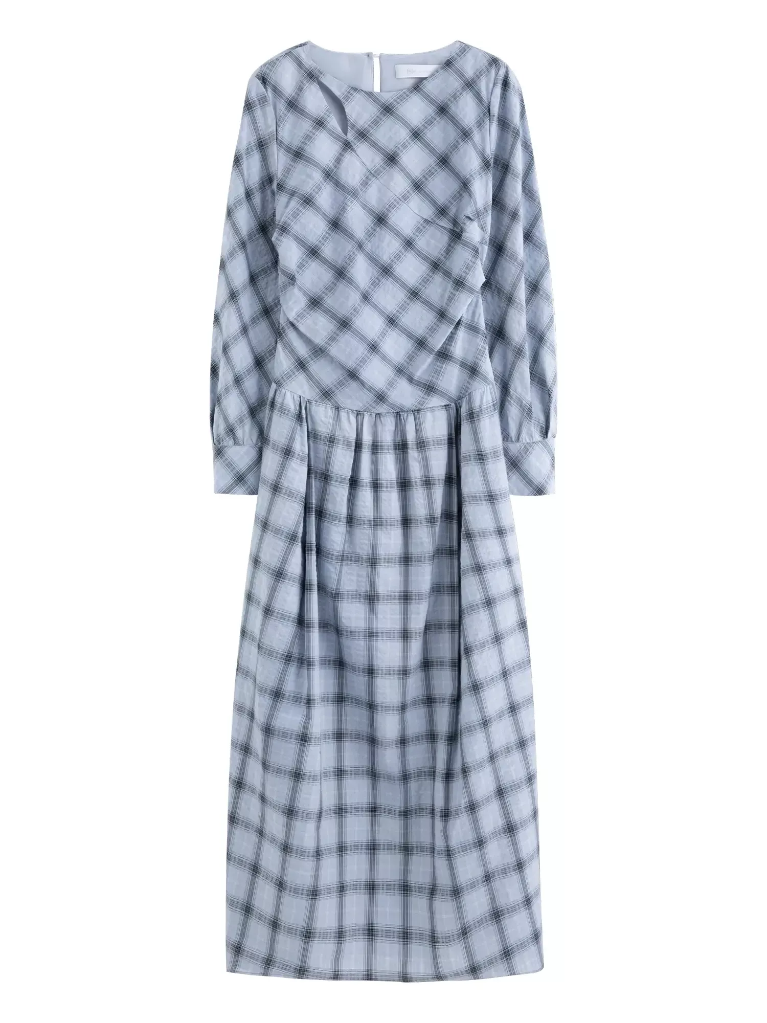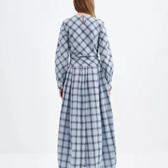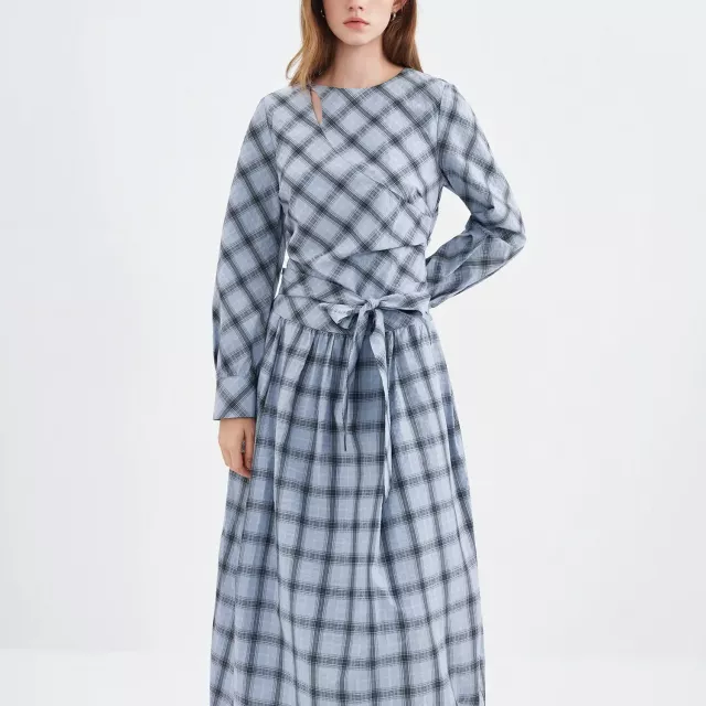 What sets this piece apart is its unique balance of classic design and modern comfort. The non-stretch 100% cotton knit fabric feels breathable yet structured, giving the dress a clean and elegant shape. The empire waist and lace-up tie detail highlight your waistline in a flattering way, while the O-neck keeps the look simple and timeless. The blue-grey plaid also gives a subtle age-reducing effect, making it youthful without feeling childish.