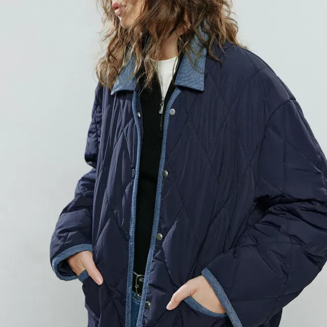 This jacket is more than just a winter layer. Its patchwork contrast design and diamond check details create a look that feels carefully crafted and artistic. The spliced panels add depth, while the asymmetric style breaks away from the usual straight-cut winter coats. The cotton filling keeps you warm naturally, while the polyester outer layer helps it hold its shape and resist everyday wear.