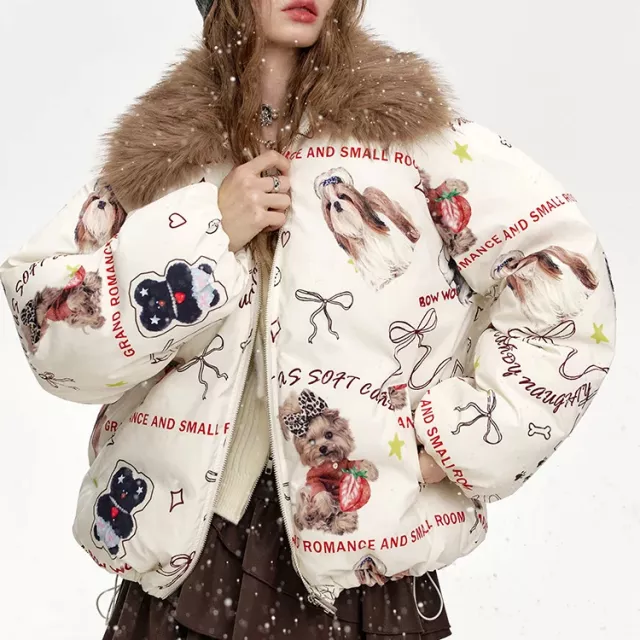 This jacket goes beyond basic outerwear by combining warmth with character. The bold cartoon print sets it apart from neutral winter pieces, helping you express your playful side even on the coldest days. Whether you’re heading out for a winter stroll, running errands, or creating a cozy layered outfit for a day out, this jacket is best used whenever you want to feel warm and look effortlessly stylish. Its versatility makes it an easy match with jeans, skirts, or casual dresses.