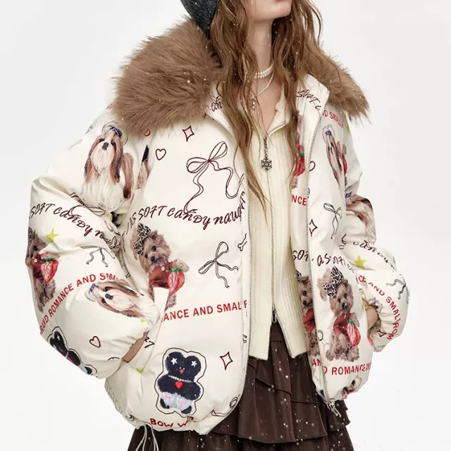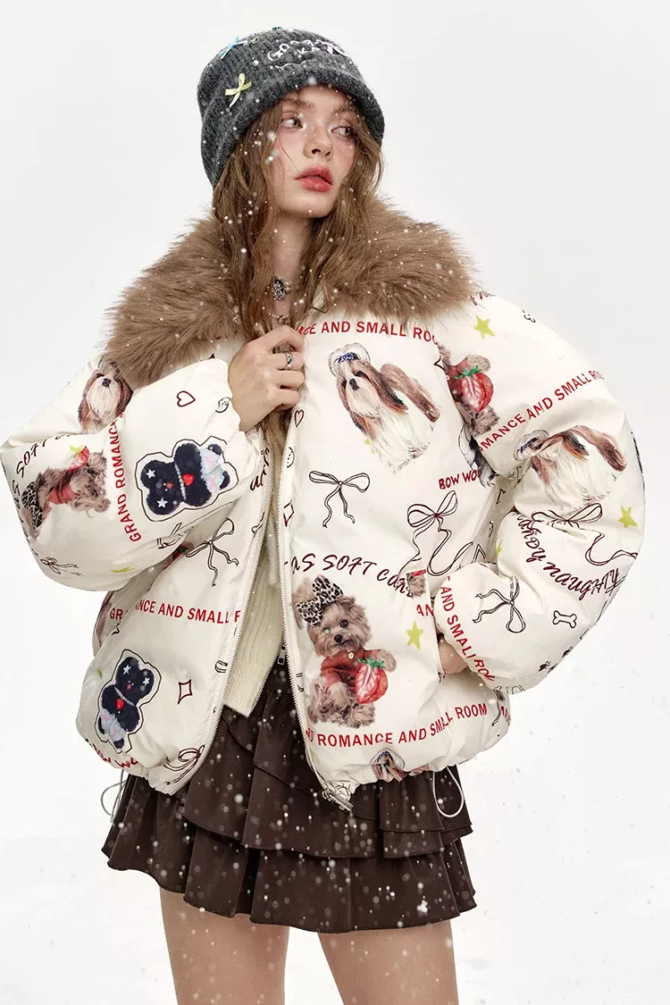 This jacket offers everything you need for cold-weather comfort. The thickened construction keeps you warm without weighing you down, while the full-length sleeves and regular silhouette ensure easy movement. Made with durable polyester and crafted with a refined tatting weave, it provides long-lasting quality with a soft touch. The playful cartoon-style puppy pattern adds a unique twist, making this jacket stand out from ordinary winter outerwear.