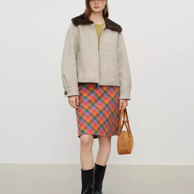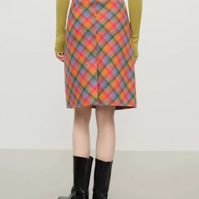 This skirt stands out with its 100% sheep wool fabric, which offers natural warmth without feeling bulky. The empire waistline creates a flattering silhouette, lifting and shaping your look while making it comfortable for all-day wear. Its A-line fit flows naturally around your body, giving you freedom of movement and a soft feminine shape. The retro rainbow plaid pattern adds a playful, age-reducing effect that keeps your outfit looking young, fresh, and stylish.