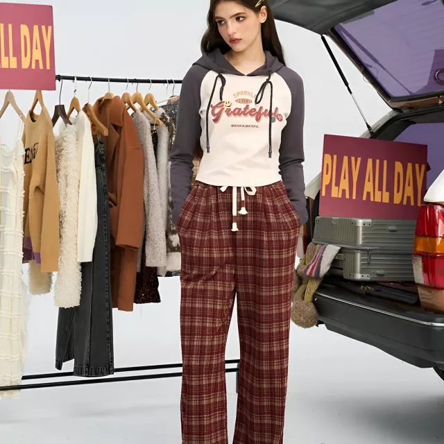 What really sets these pants apart is the perfect balance between comfort and style. The knitted blend fabric with slight stretch moves with your body, making them ideal for all-day wear. The lace-up detail at the waist adds a subtle vintage charm while also helping with a better fit. The plaid pattern is bold yet easy to match, giving you a statement piece that still feels versatile.