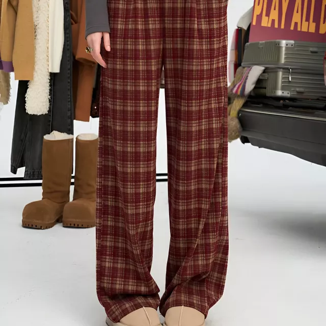 Meet your new cold-weather favorite. These red plaid winter pants bring a bold retro vibe with a relaxed, straight-leg fit made for real life. Designed with a high waist and soft knitted fabric, they offer comfort, warmth, and easy styling all in one piece. The classic plaid pattern adds a timeless touch, while the loose silhouette gives you room to move without feeling bulky or restricted.