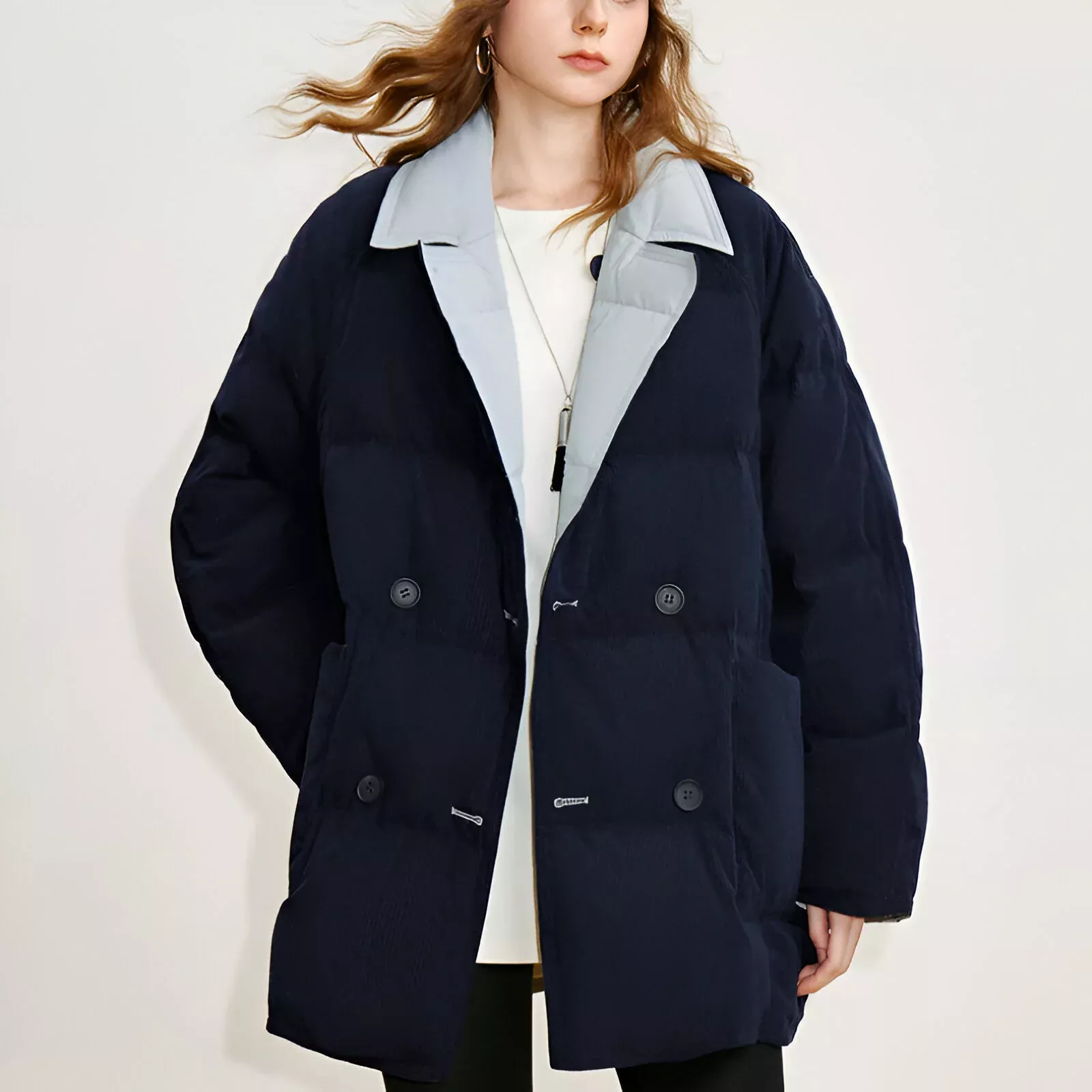 Step into winter with confidence and comfort in this stylish reversible down jacket. Designed for modern women who love versatility, this piece gives you two distinct color block looks in one coat. Switch sides depending on your mood or outfit and enjoy a fresh style every time you wear it. The clean notch lapel design adds a touch of polish, making it perfect for both casual outings and dressed-up winter days.