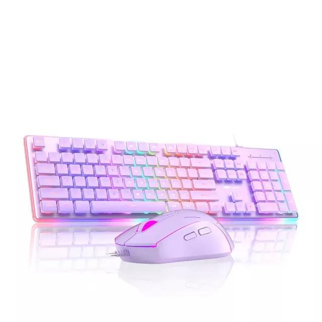 The keyboard features crystal-clear pudding keycaps that allow the RGB lighting to shine through beautifully, creating a vibrant and uniform glow. With ergonomic curves and foldable brackets, you can adjust it to your preferred height for maximum comfort. The mouse is just as impressive, featuring 7-color breathing backlight effects that match your setup and keep you immersed during intense gaming sessions.
