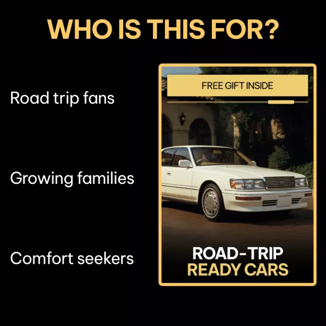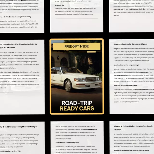 Unlike generic car lists, Road-Trip Ready Cars focuses entirely on real road-trip scenarios—comfort over hours, fuel savings over miles, and features that actually improve your journey. It combines practical advice, relatable examples, and clear decision-making tools in one convenient digital download.