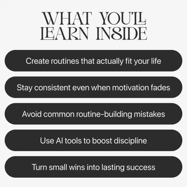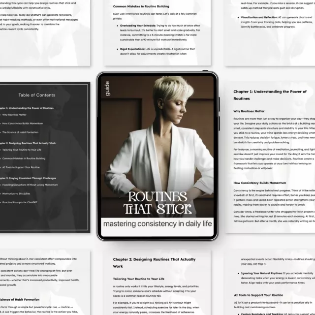 Routines That Stick combines modern habit psychology with practical tools for real-world consistency. Unlike generic guides, it focuses on flexible strategies and personalized systems that grow with you. You’ll also discover how AI can support your progress—helping you stay motivated, track results, and adjust your habits intelligently over time.
