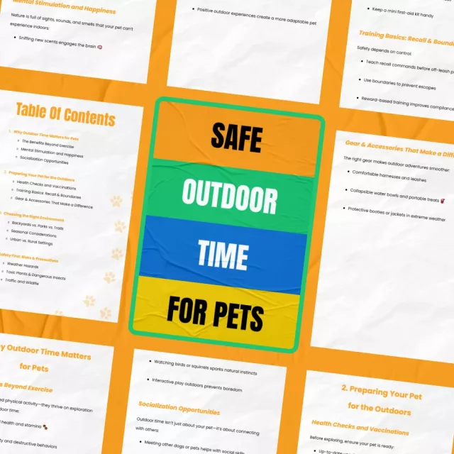 Unlike other pet guides, “Safe Outdoor Time for Pets” offers a holistic approach, addressing not only the physical preparation for outdoor activities but also the mental and emotional well-being of your pet. With actionable advice, real-life case studies, and technology-enhanced tips, this eBook stands out as a trusted resource for creating enriching outdoor experiences.