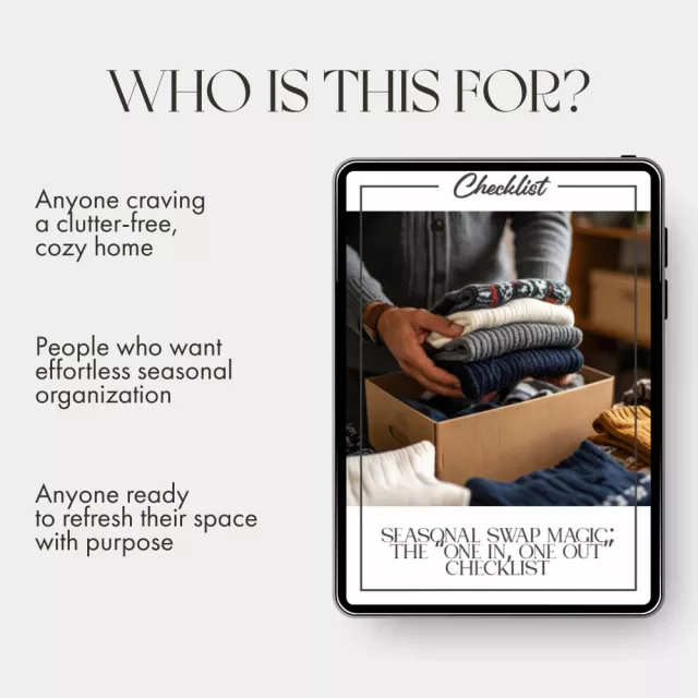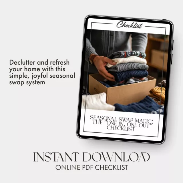 Take control of your home with Seasonal Swap Magic: The “One In, One Out” Checklist—the ultimate tool for learning how to rotate seasonal items with one in one out. Download it today, declutter with confidence, and enjoy a home that feels light, organized, and ready for every season!