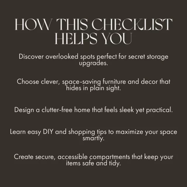 Make your home both functional and fascinating with Secret Stash: Your Ultimate Hidden Storage Checklist. Download your digital checklist today and start uncovering the endless possibilities of clever, beautiful, and secure hidden storage solutions!